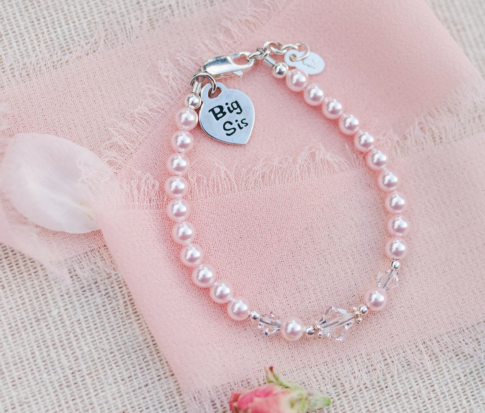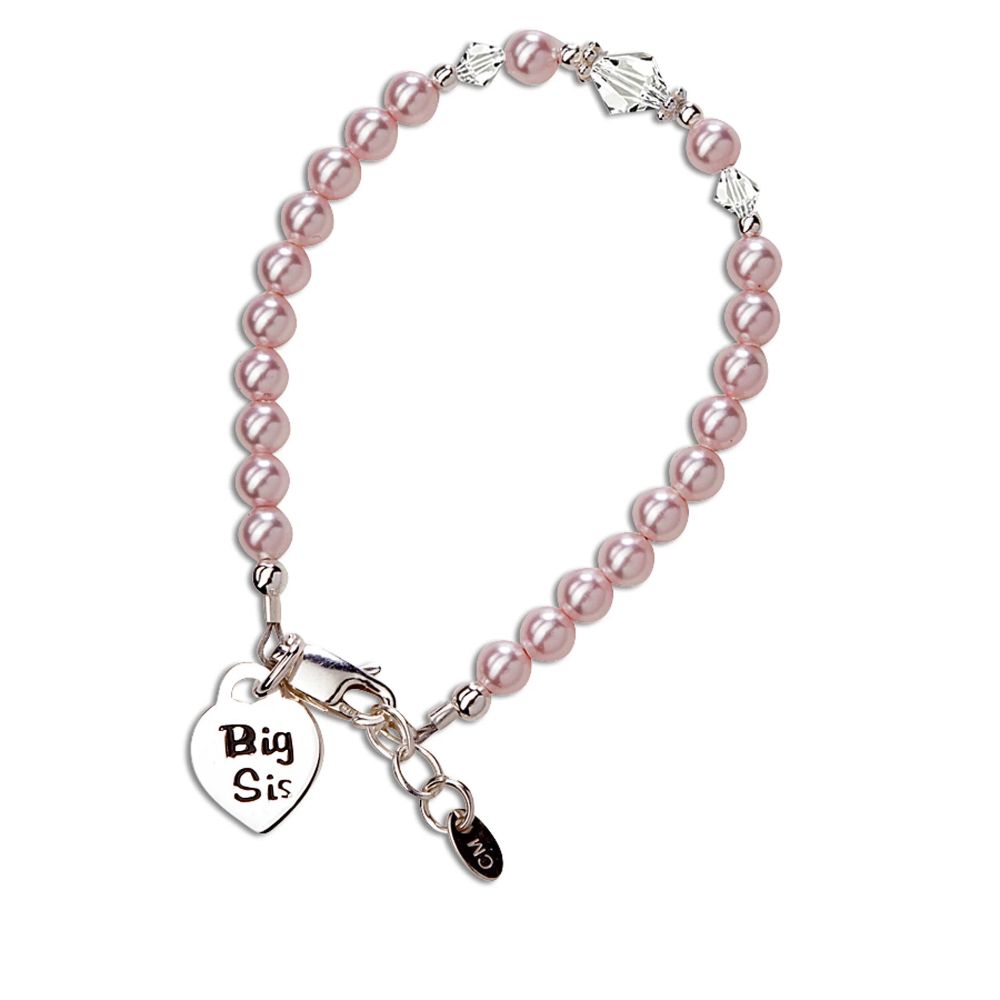 This adorable sterling silver bracelet has soft pink high-end simulated pearls crystals with sparkling silver accents and darling "Big Sis" heart charm - perfect gift for sisters! Bracelet features our adjustable sizing you will love. Just move to the next ring as the child grows for a perfect fit. Bracelet is lead free, nickel free and is safe for your little one to enjoy.