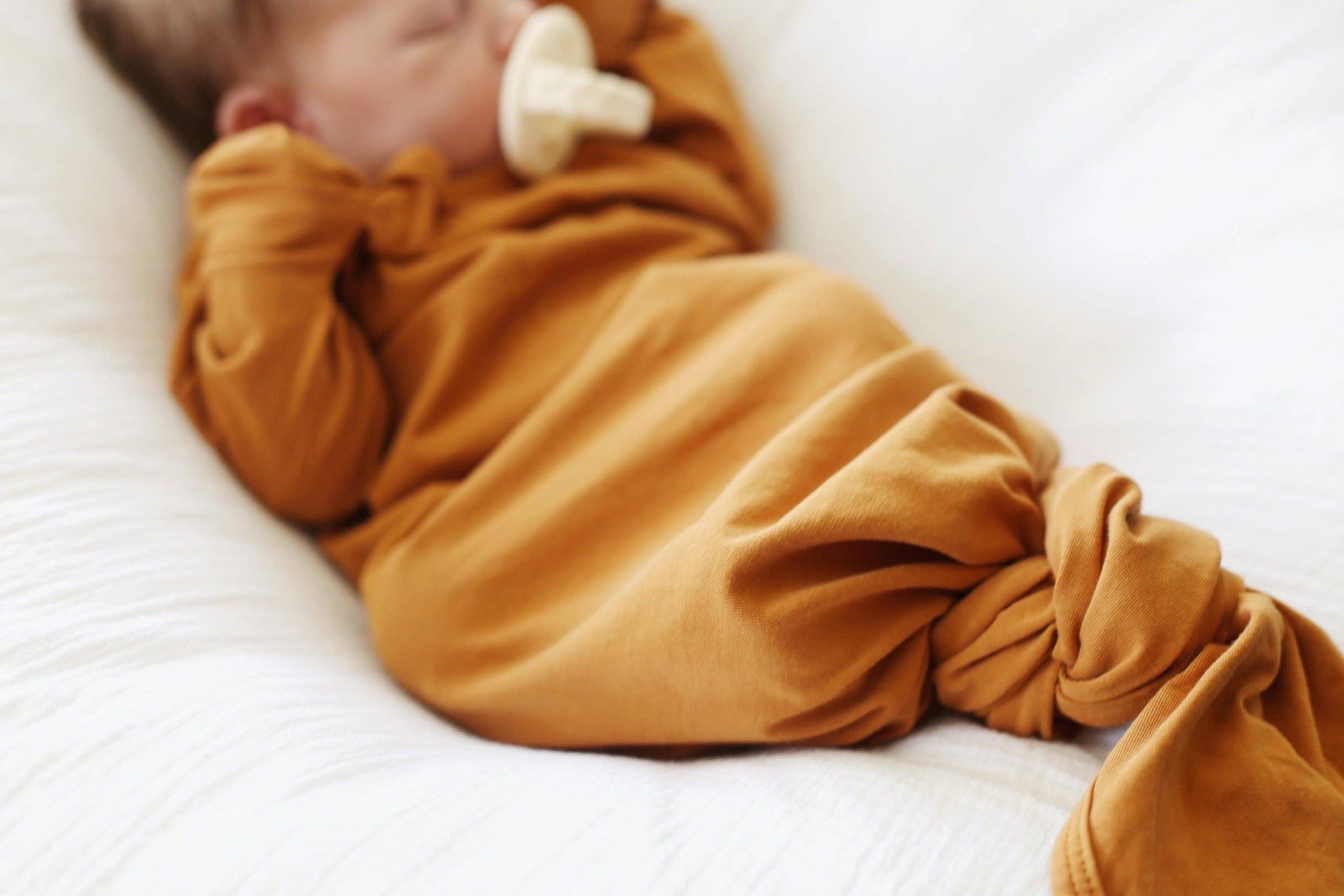 Marlowe & Co's cinnamon knotted gown is made from a soft blend of 95% organic cotton and 5% spandex fabric. Our gowns are made with high quality stitching, and will not lose their softness over time. Designed to be soft and delicate on your baby’s skin, our gowns will provide the perfect amount of stretch and comfort for your little one. The length of the knot is adjustable to allow your little one to grow with the gown.