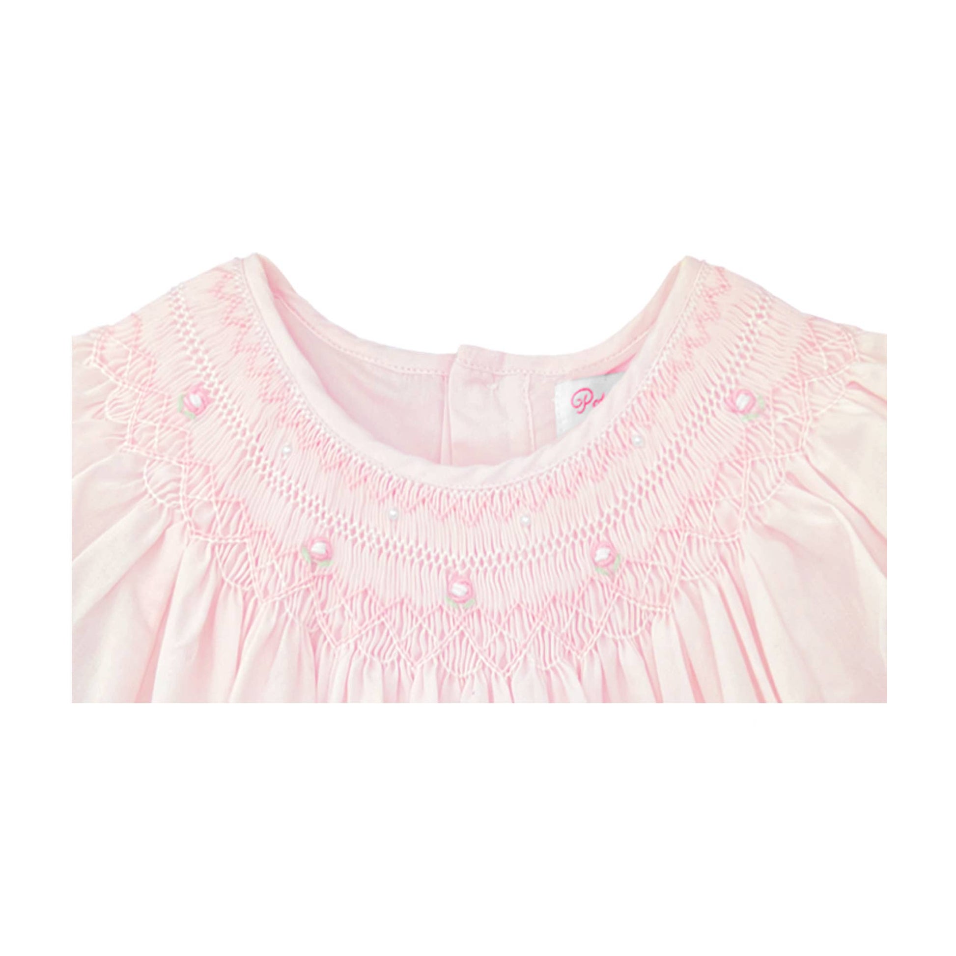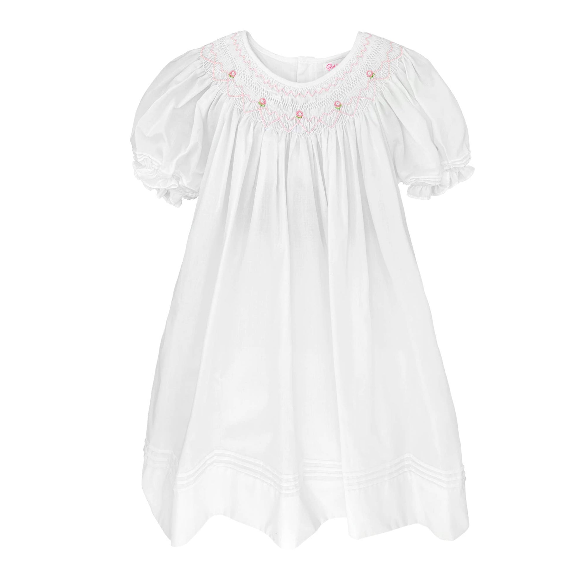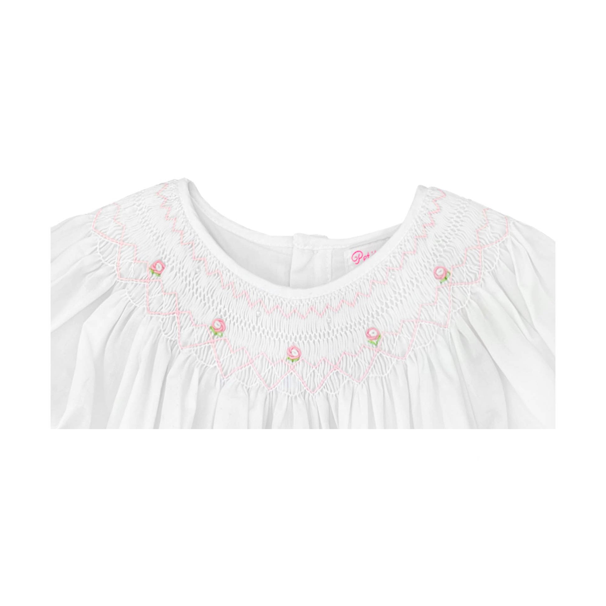 Featuring heirloom-quality handcrafted details like heart smocking and embroidered flowers with pearl accents, this piece is sure to become a treasured keepsake.