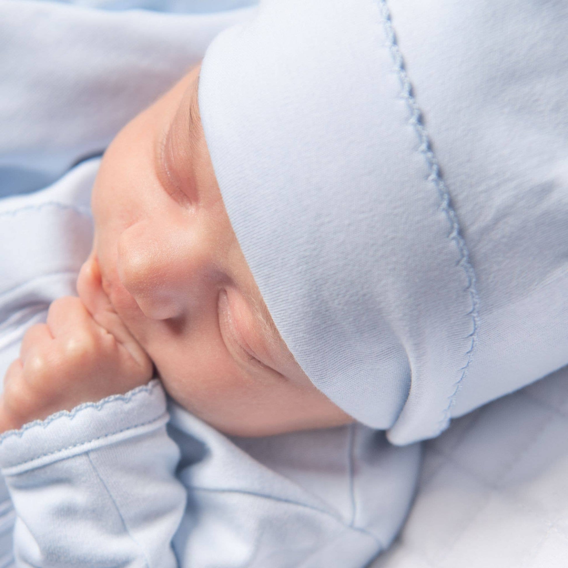 Magnolia Baby's Essentials Solid Blue Hat is a must-have for your baby's layette. The buttery soft, light blue Pima cotton with picot trim makes this sweet hat a classic staple. You can use it as is or add your embroidery or monogram to make it a keepsake. It's a perfect baby shower gift or take-me-home outfit. * Coordinates with other items in the Solids Collection * 100% Pima Cotton *