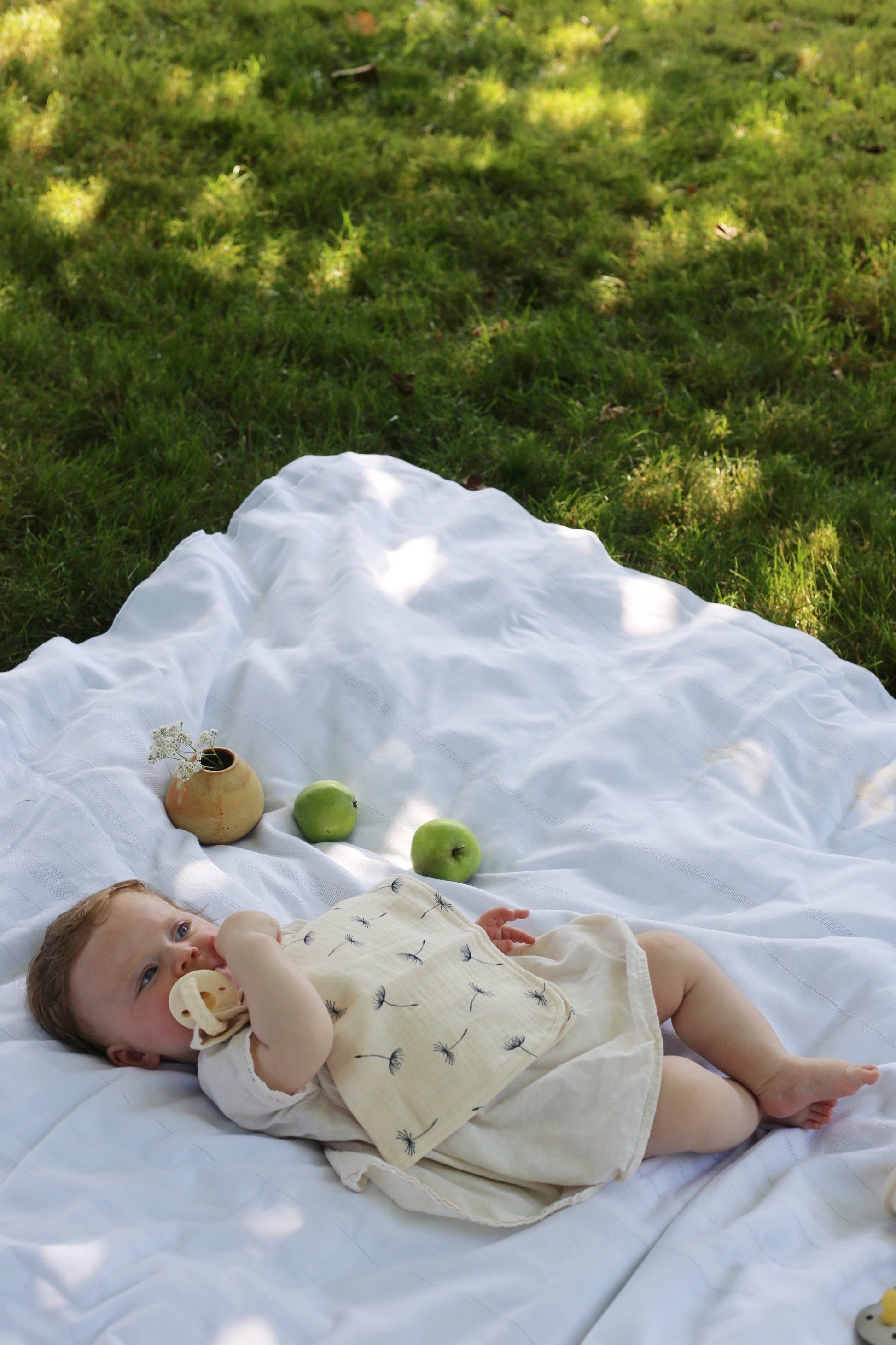 Our floral vanilla lovey blanket with snap closure (Pacifier and Teether not Included) is made from a double layer of 100% soft organic cotton muslin that is soft and lightweight, perfect for all seasons and will not irritate sensitive skin.