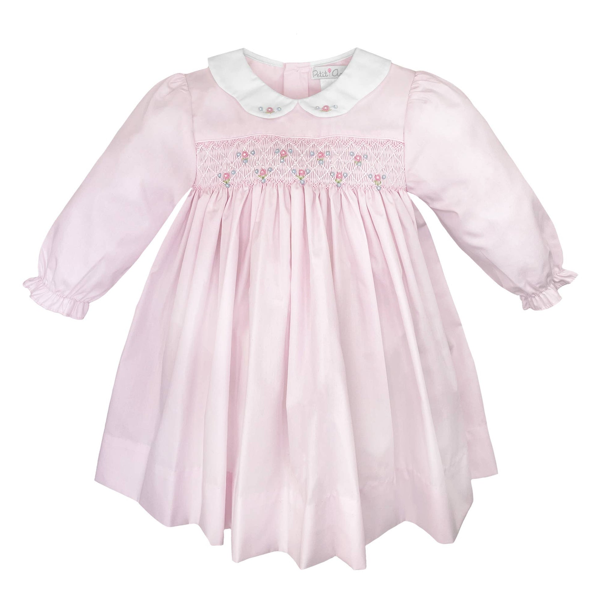 This long sleeve dress comes in a pastel pink fabric with a fully smocked panel across the front with embroidered flowers and a white petal shaped peter pan collar with embroidered details.