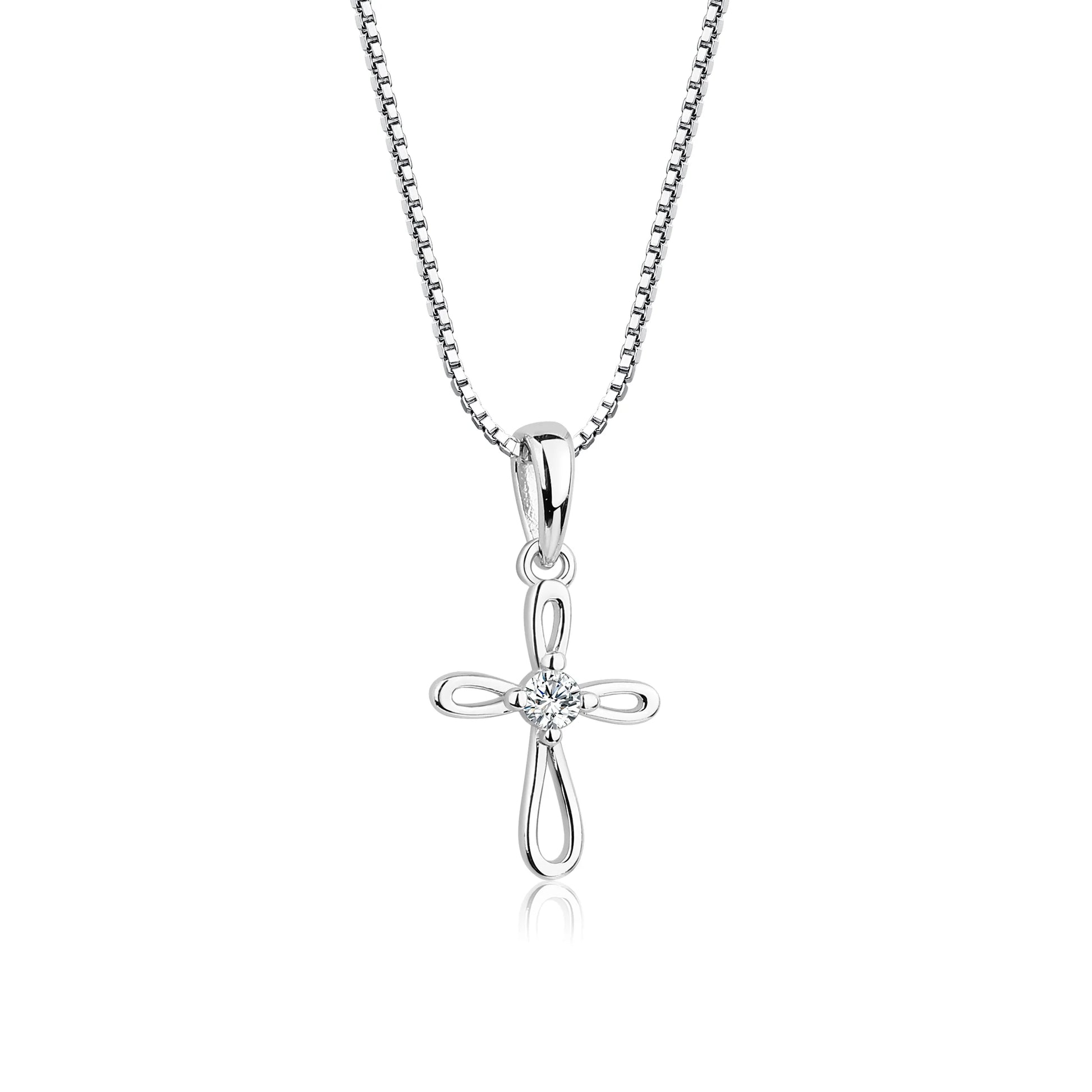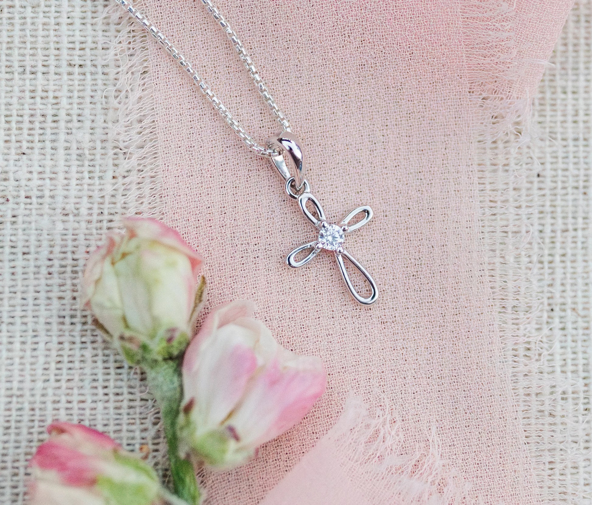 Classic girls sterling silver infinity cross charm necklace with tiny sparkling CZ stone. This comes on a durable 14" chain with a high-quality lobster clasp with matching earrings available. Perfect gift for those special occasions! Makes a great First Communion gift too. This is a special keepsake gift for toddlers, kids, and little girls and comes in a beautiful gift box that kids love.