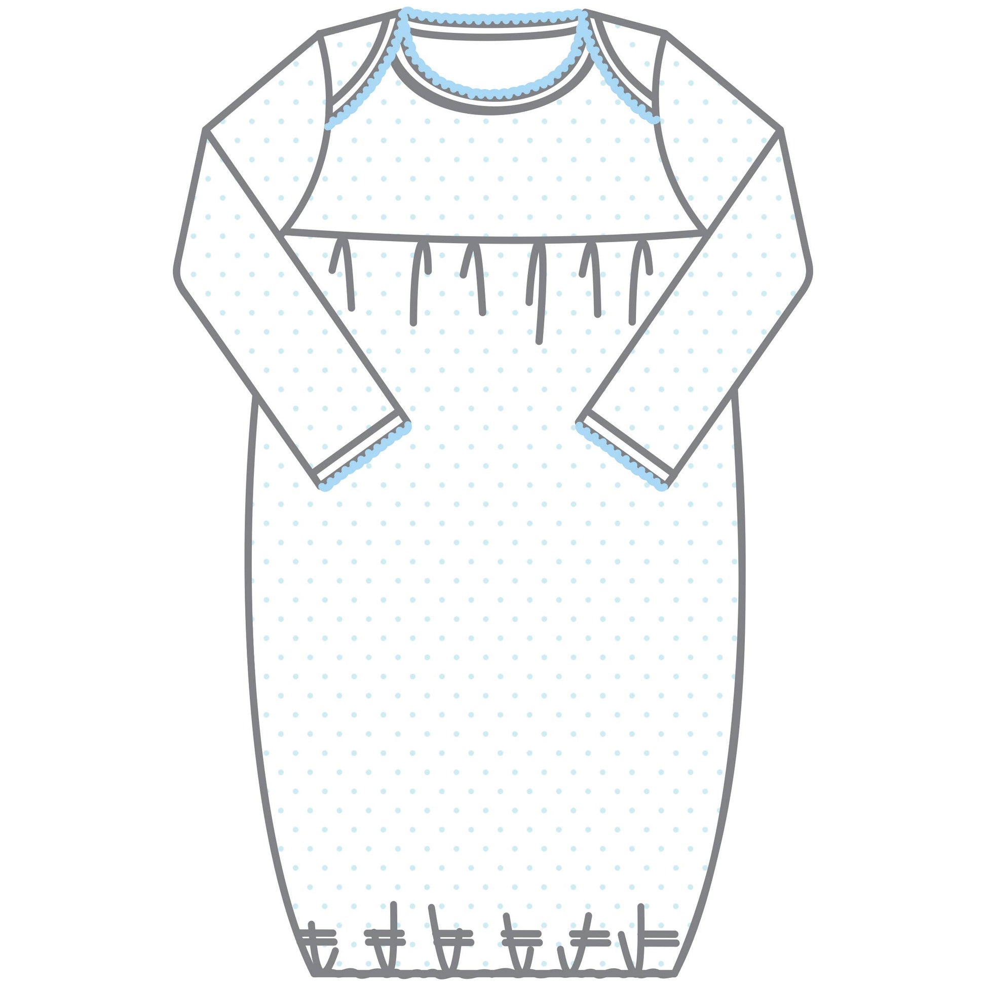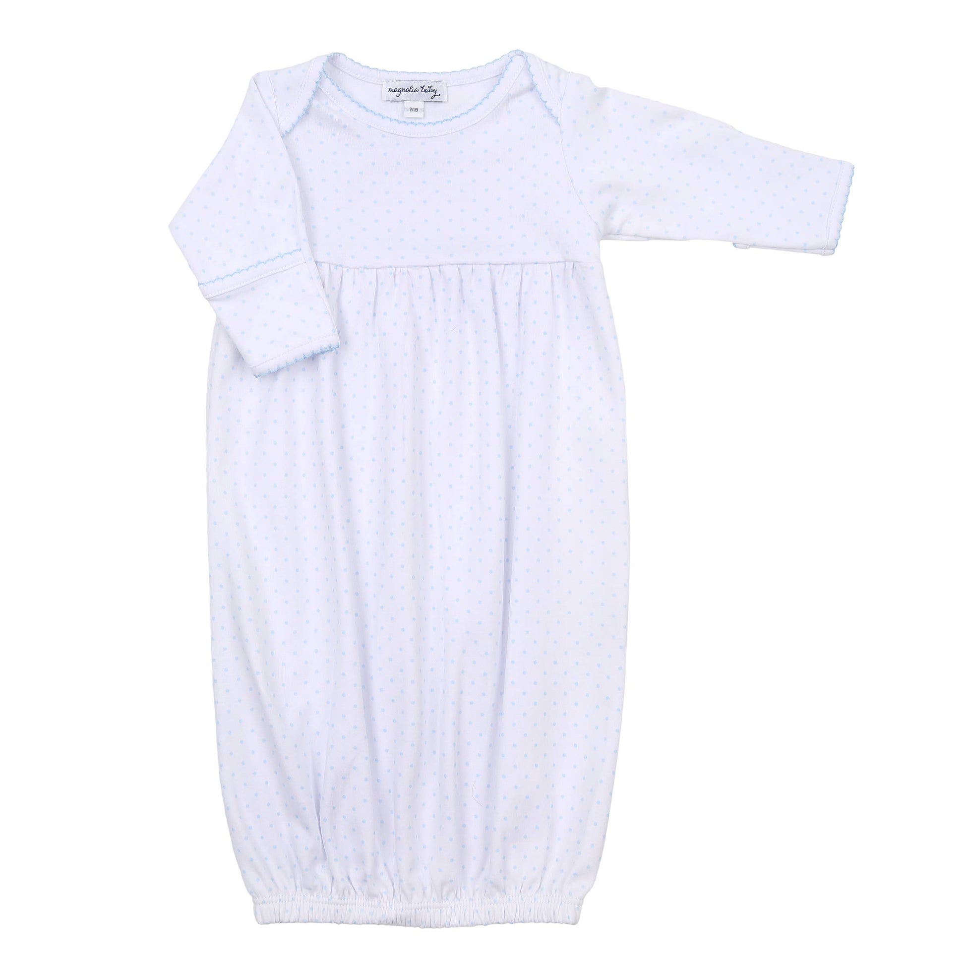 Introducing the Mini Dots Gathered Gown in Blue by Magnolia Baby - a timeless and versatile addition to any baby's layette. This soft Pima cotton gown features a delicate mini dot print and an elastic bottom for easy changing. The long sleeves offer warmth and comfort for everyday wear and special occasions alike. With its customizable options for embroidery or monogramming, it also makes for a unique and personal gift.