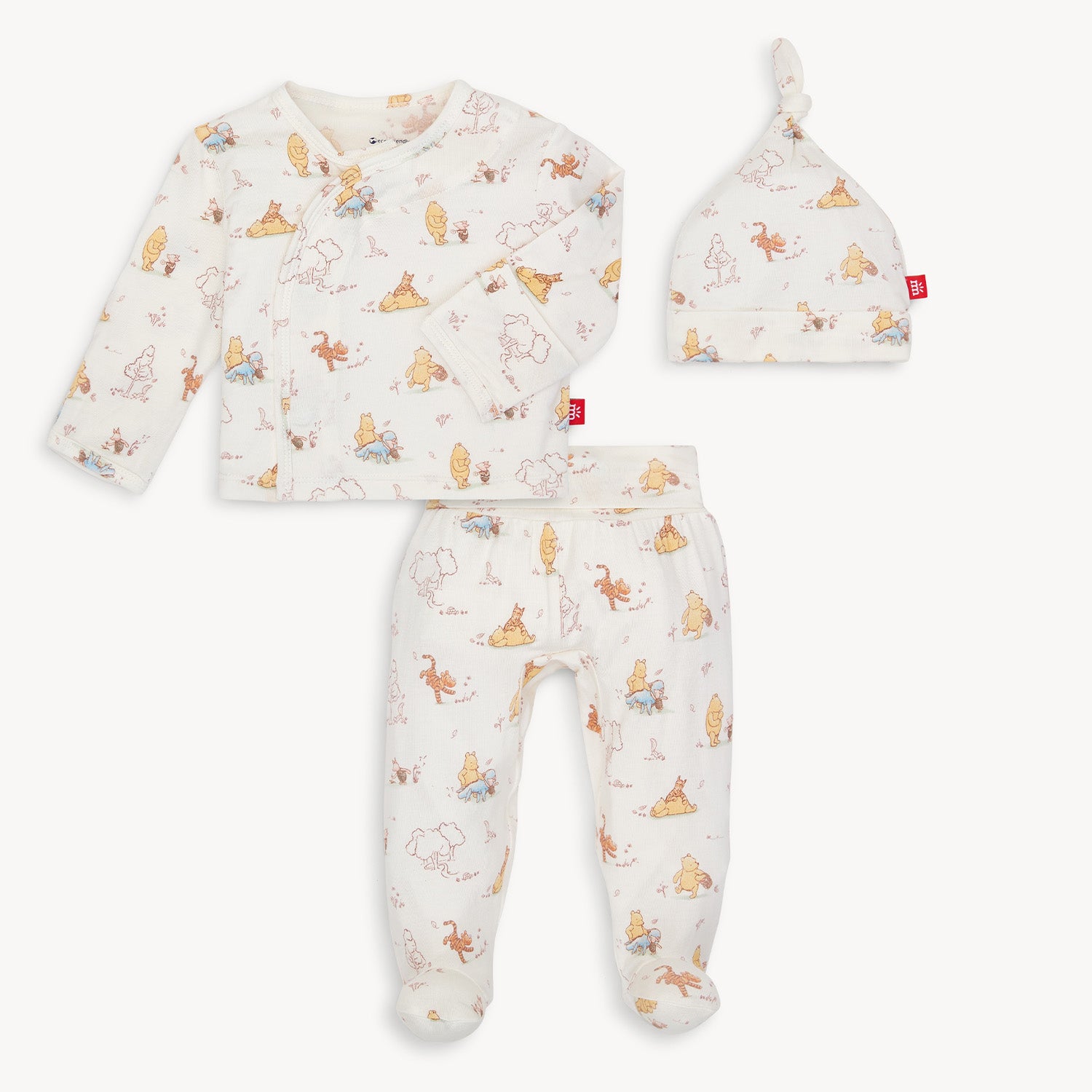 Wrap your new bundle of joy in the modal Take Me Home Set. The kimono wrap-style top fastens with magnets for quick, foolproof changes, while a roomy fit is gentle on healing belly buttons. Footed pants provide stay-put warmth, while built-in mittens prevent scratches. A hat completes the ensemble—made from silky-soft, breathable modal for all-seasons comfort.
