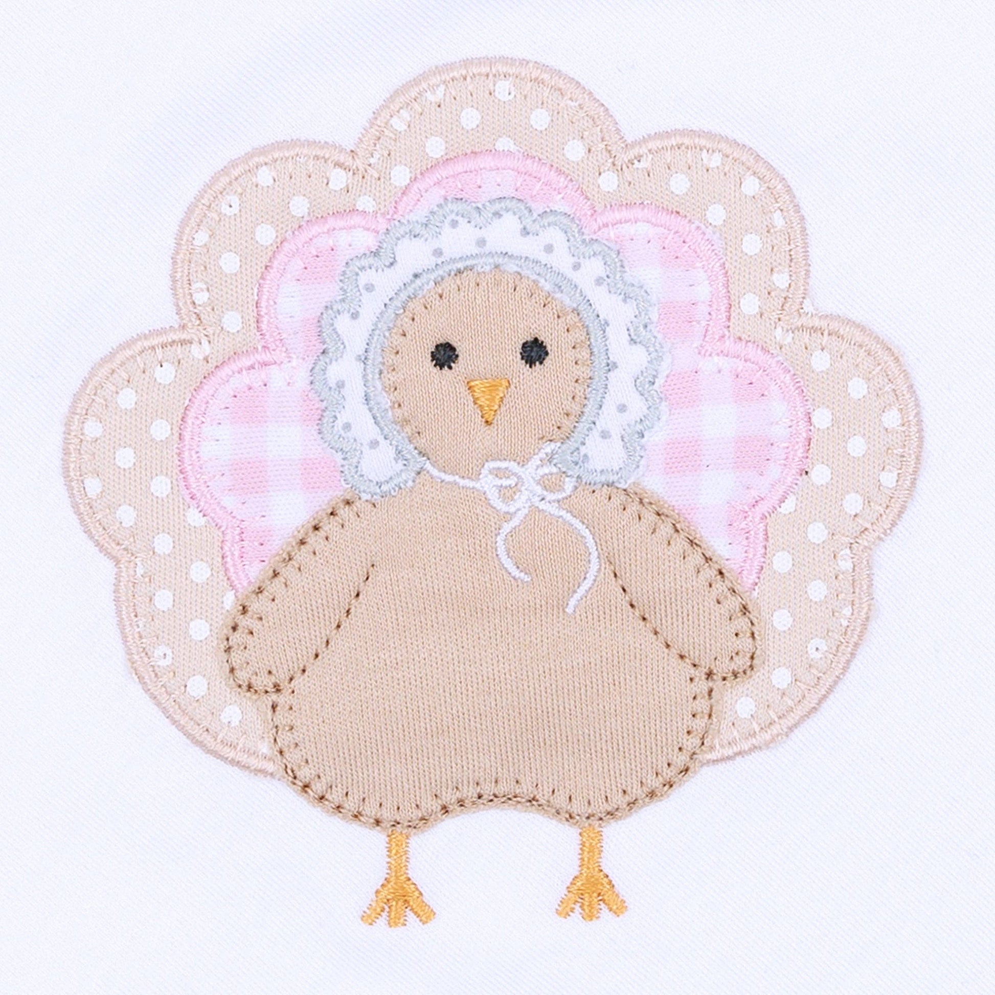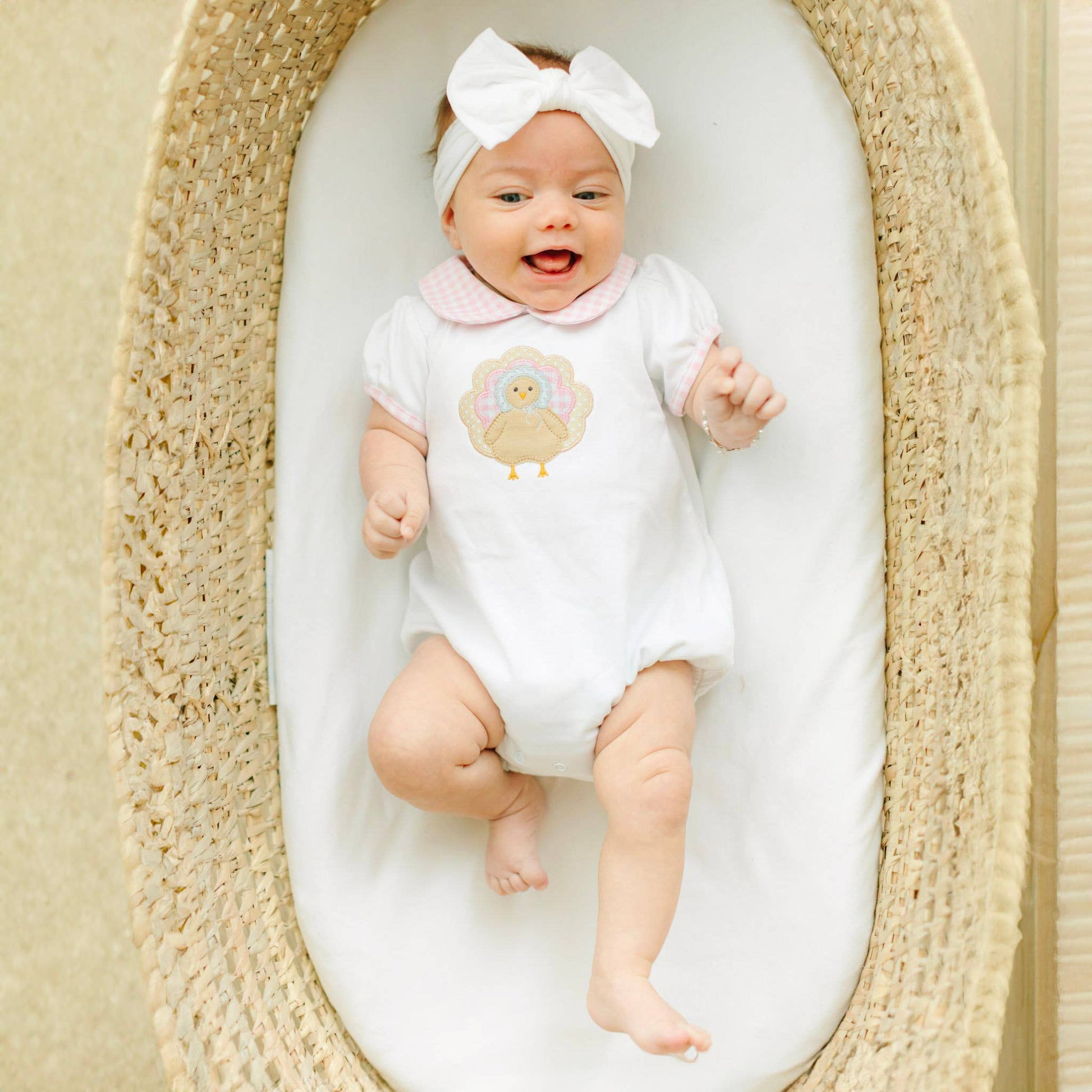 Magnolia Baby Pilgrim Pals Applique Collared Short Sleeve Bubble - Pink Celebrate Thanksgiving in adorable style with our Pilgrim Pals Applique Collared Short Sleeve Bubble! Inspired by the Thanksgiving holiday and the imagery of Pilgrims and the fall harvest, this charming one-piece features a delightful turkey appliqué on luxurious Pima Cotton, perfect for your little girl.