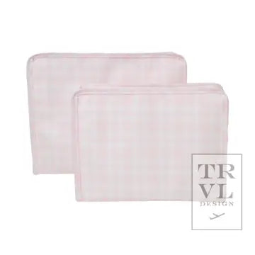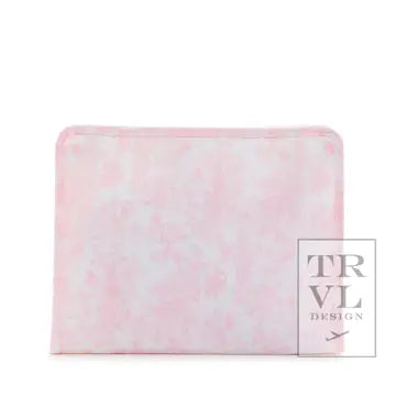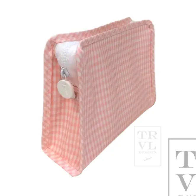 Our best-selling Roadies are our BFFs in the pouch world! Our Large Roadie is made with a thin Eco-friendly matte coating, an inside slip pocket and exterior snap open zip tabs for a wider opening and an easier access. Size: 9"l x 7.25"h x 3"d. Coated Cotton, Lined in poly twill, and Chunky White Zipper with snap closure. Water and stain resistant & wipeable inside and out.