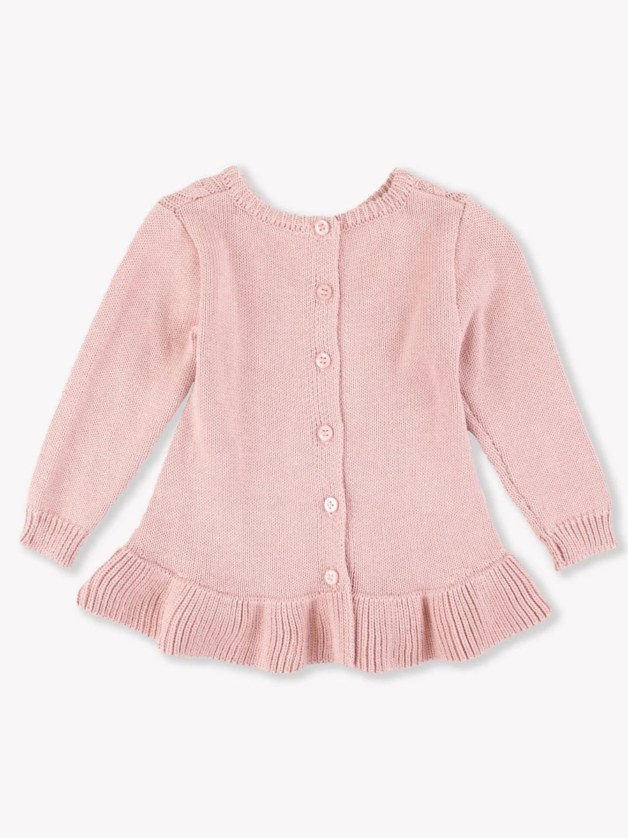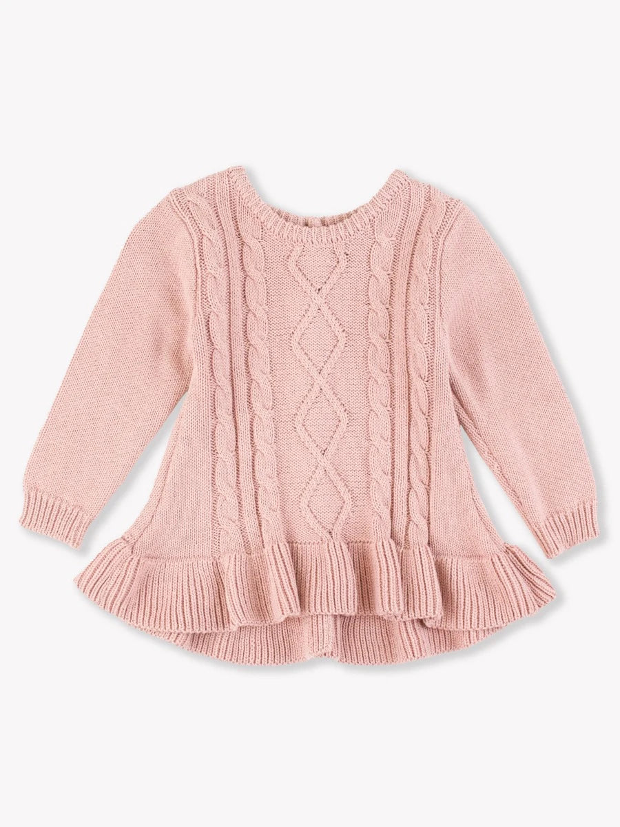 Add a touch of charm to her winter wardrobe with our Girls Ruffle Hem Cable Knit Sweater. Crafted from cozy cable knit fabric, this sweater features a delightful ruffle hem detail that adds a feminine touch. Perfect for chilly days, it pairs effortlessly with jeans or skirts for a stylish ensemble that keeps her warm and comfortable.