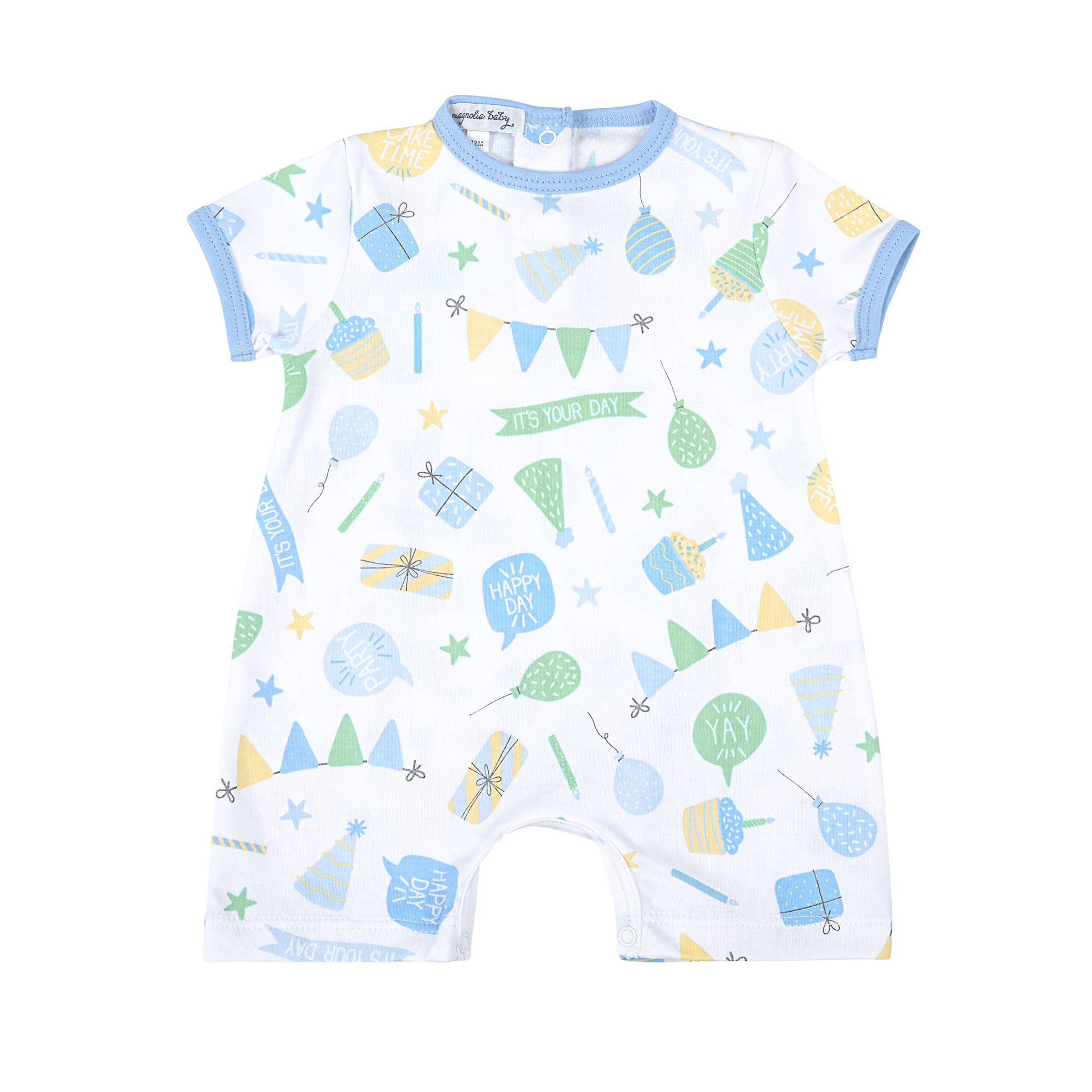 Magnolia Baby presents the Time to Celebrate Blue Printed Short Playsuit, an embodiment of comfort, style, and luxury. Crafted from the highest-grade Pima cotton, this non-footed bodysuit ensures delicate softness for your baby's skin. Our sophisticated design is perfect for everyday wear or special occasions, offering a fresh, stylish sophistication. Dress your little ones in Magnolia Baby's distinctive quality and charm.